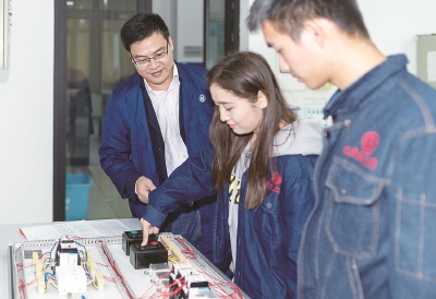 图为全国高等院校工程应用技术教师大赛一等奖获得者王志刚老师指导学生进行电器控制实训